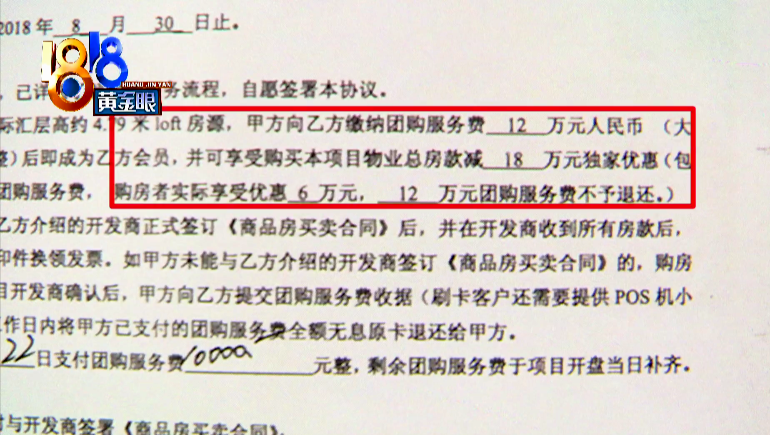 团购服务协议上写明,甲方是杭州泰隆行房地产策划有限公司,乙方是何女士夫妻。协议内容是交12万元团购服务费,可以享受购房减18万元的优惠,也就是说购房者实际可优惠6万元。