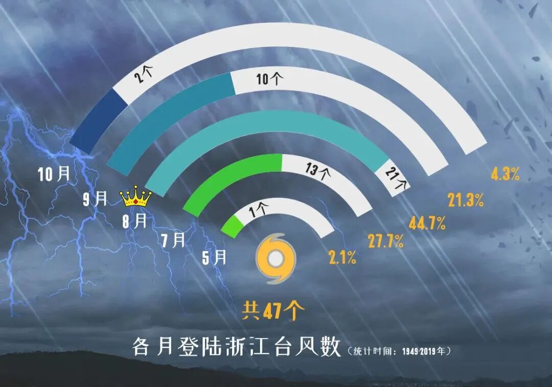 据统计,1949-2019年登陆浙江的台风总数8月为最多,达21个,占登陆台风总数的44.7%。
