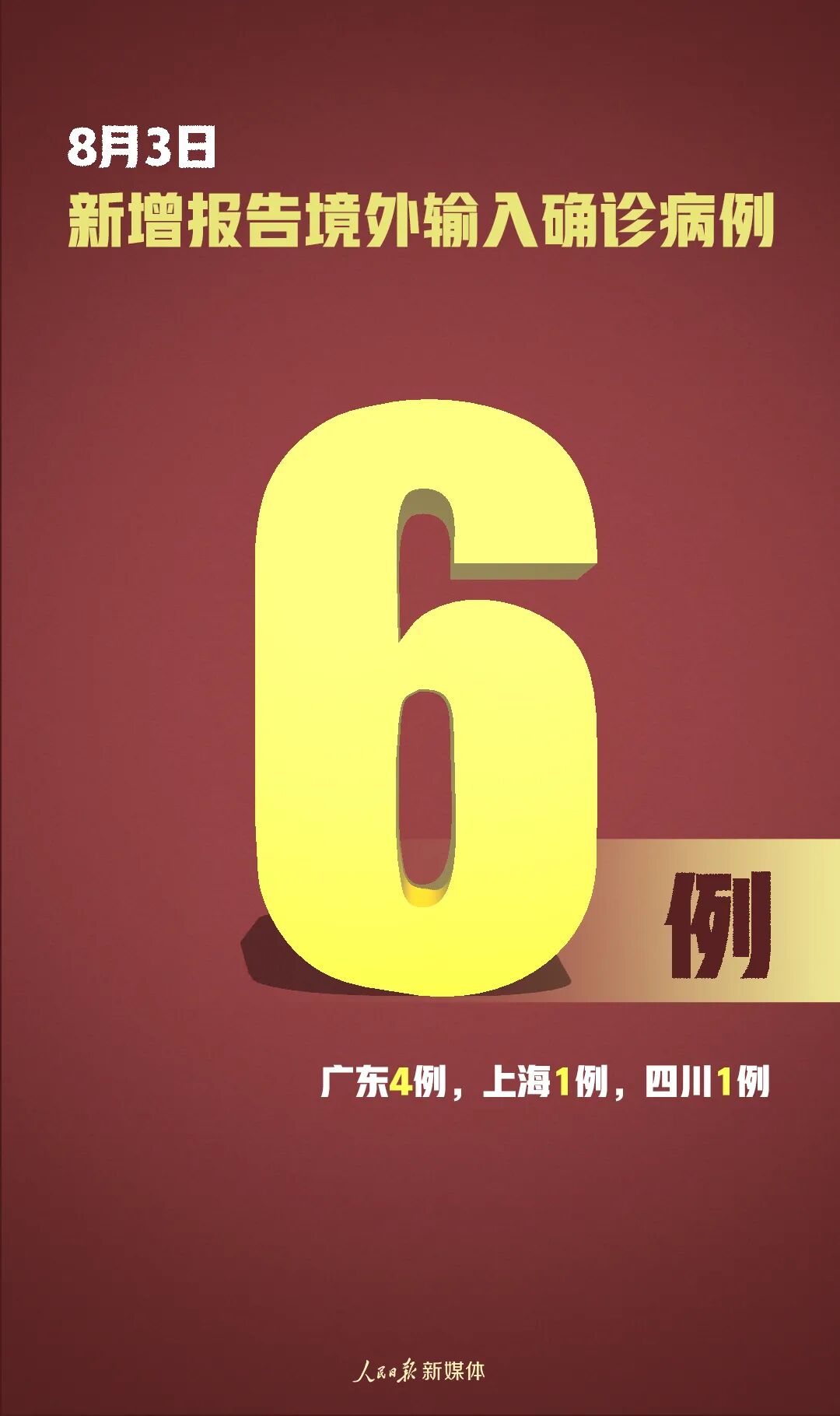 8月3日0—24时,31个省(自治区、直辖市)和新疆生产建设兵团报告新增确诊病例36例,其中境外输入病例6例(广东4例,上海1例,四川1例),本土病例30例(新疆28例,辽宁2例);无新增死亡病例;新增疑似病例1例,为境外输入病例(在上海)。