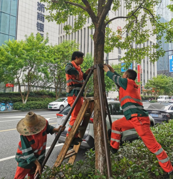 根据杭州市防指办启动的预案等级要求,全市园林绿化管理部门也从3日开始有序地进行抗台应急准备工作。台风来袭,道路风口、沿河、沿湖都是重点要关注的区域。西湖景区早早地对保俶路口高坎上的树木进行了加固,对沿湖树木进行了支撑。上城区、下城区、富阳区、江干区、拱墅区和钱塘新区等城区绿化管理部门也都在积极迎战“黑格比”,迎着风、顶着日头,将一根根钢管牢牢地撑在树木的身上!台风季,高架挂箱的稳固性同样被列入重点防范和检查的名单中。各城区连夜对高架挂箱的稳固性进行排查,确保万无一失。