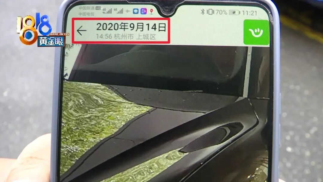 钱先生把提车时拍的这张照片放大,显示在同样的位置确实有一个凹坑,照片的拍摄时间是9月14号下午两点五十六分,钱先生说,车子是当天下午五点多才提走的。销售员小沈也从西湖保时捷中心南山路展厅赶到了绍兴路售后中心。
