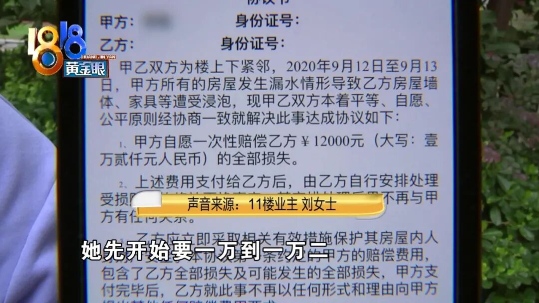 11楼业主 刘女士:“我承认我们家漏水漏到他们家这个事实,那先开始我们是带着歉意到她家去道歉了。我知道正常维修费用,是三到五千,我真的是不想费事,我说给你一万二,她先开始要一万到一万二,我说那给你一万二吧,然后给一万二她又变卦了,说她家电器一年以后要是坏了怎么样。我就觉得我都退了那么多步,确实是我们家有错在先,但是也不至于说这个钱你说多少就多少。”