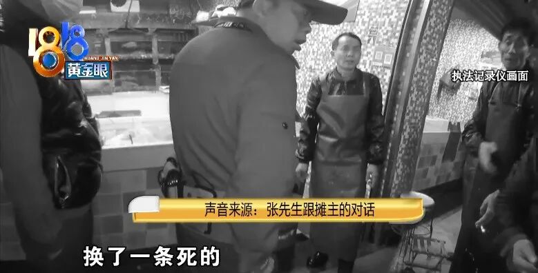 杭州石桥派出所 李警官:“怎么回事情(张先生 :我买了两条活鱼,你看,一条活的,一条死的,装好,钱付过了,给我一条死的,他给我放在那里,给我换了一条死鱼)(摊主:没换)”