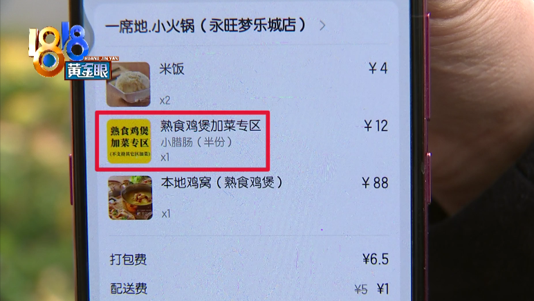 12月8号晚上8点57分,朱女士通过美团外卖下单,在一席地杭州永旺梦乐城店买了一份熟食鸡煲,又在熟食鸡煲加菜专区,加了半份小腊肠,一共花了80块钱左右。