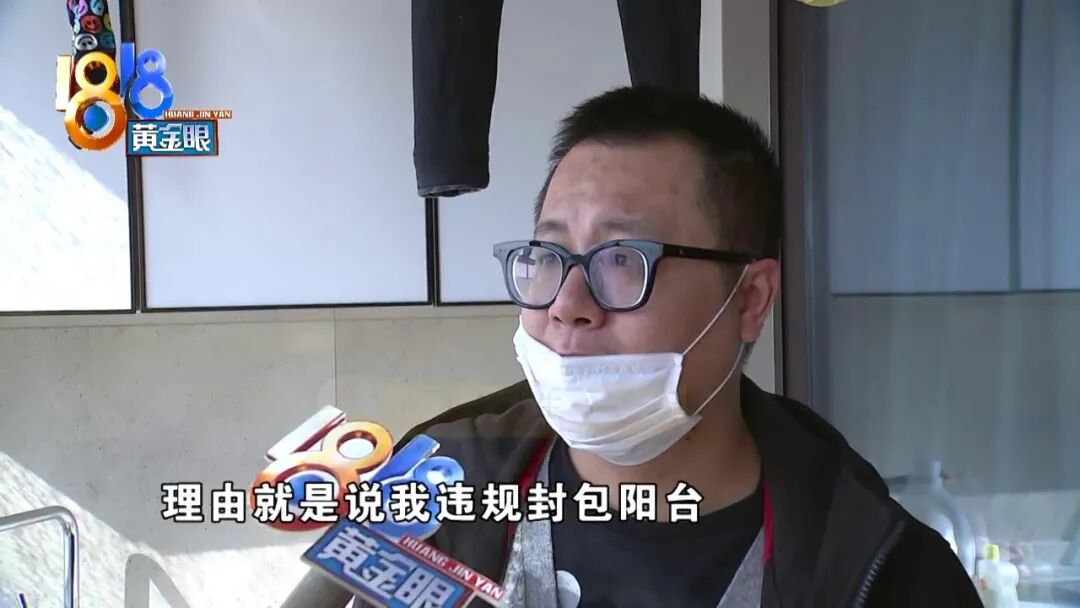 钱先生:“理由就是说我违规封包阳台 。(违什么规呢) 所以说我就不知道我哪里违规了,我所有包阳台的方案都已经公示过了 。业主大会投票,逐家逐家去签字,最后通过了业主大会 包封阳台相关的方案。(什么时候通过的) 2020年的七月份,我是2020年八九月份包的阳台,我觉得这个是非常野蛮地损坏我个人财物,我也想问问物业它有没有这个权力,可以来敲玻璃,是谁给它这个权力,是哪个部门授权它做这个事情的。”
