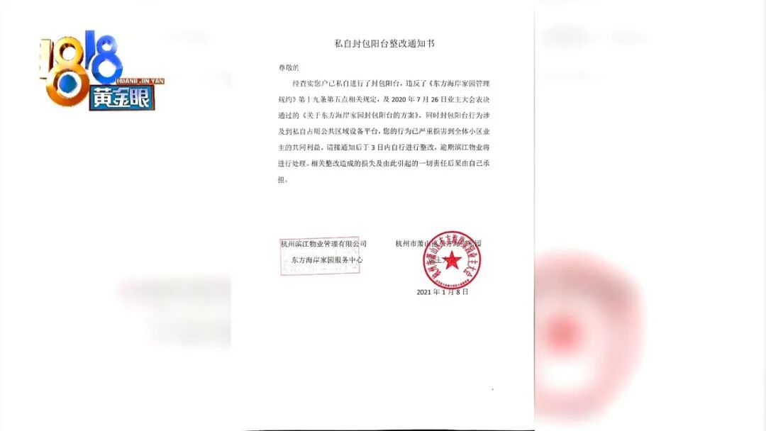 杭州滨江物业相关负责人 袁经理:“因为从全体业主的角度来讲,这几户业主属于私自封包,因为其实封包阳台,业委会一直在主导这个事情,大家都希望整体有序地封包阳台,而不是说,你想封就封,也是希望他们先把玻璃窗户先拆下来,等到业委会整体方案,大家按照方案统一执行。”