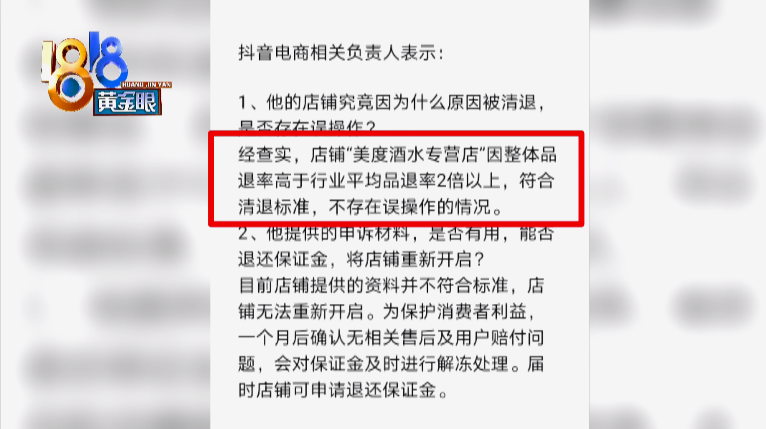 记者联系平台核实情况,后来,抖音电商相关负责人回复称,经调查,该店铺整体品退率高于行业平均品退率2倍以上,符合清退标准,不存在误操作;