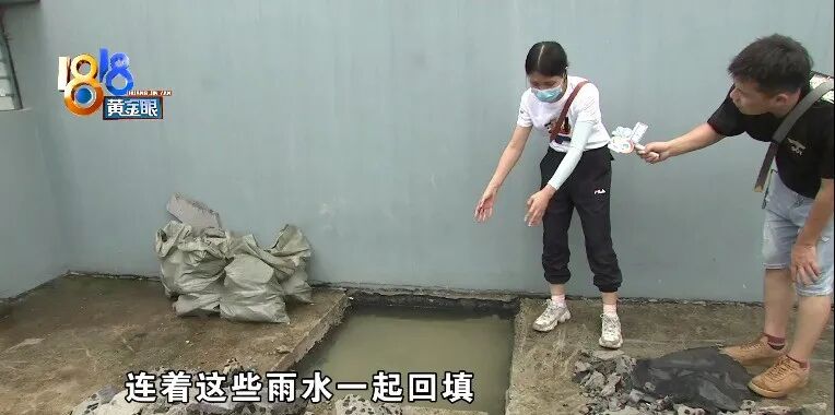 王女士:“我这个底下不是阳台漏水吗,他就这样给我凿了一个坑,黑色就是防水涂料,涂了以后,他们就用这个废石回填,连着这些雨水一起回填,因为我上来看了这些回填方式,我制止了,我就联系到邻居家,发现这样的修补是没有用的。”