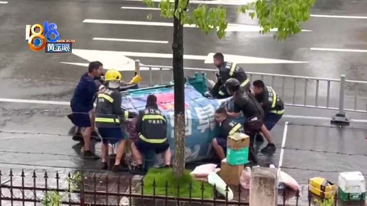 昨天中午12点半左右,宁波鄞州区一个消防救援站门口,一辆快递三轮车翻了,紧接着,消防员们冲了出来。