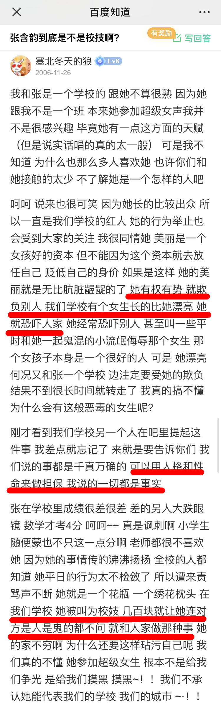 在Ta的描述中,张含韵数学只考4分,组织校园暴力、把别人逼到转学,为了几百块钱出卖身体和人格。