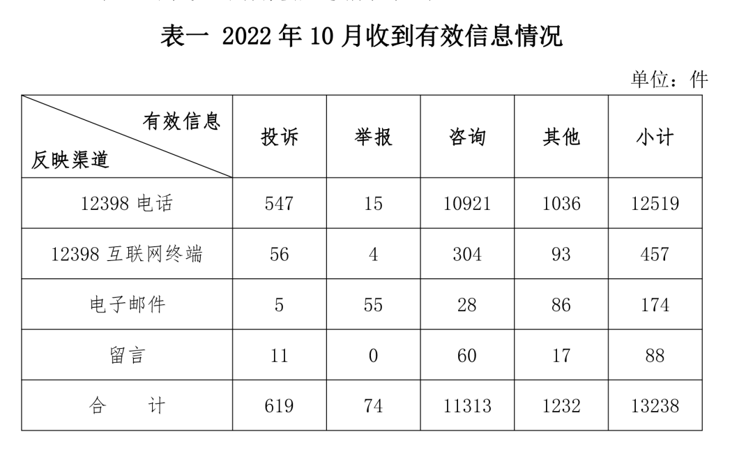 各省(自治区、直辖市)按照接收的有效信息数量排序,河北、山东、广东、河南、江苏、陕西、辽宁、四川、黑龙江、浙江排在全国前10位;按照接收的投诉举报数量排序,河北、黑龙江、内蒙古、四川、陕西、河南、辽宁、江苏、山东、安徽排在全国前10位;按照办结属实的投诉举报数量排序,重庆、河南、山东、黑龙江、四川、吉林、辽宁、广东、浙江、内蒙古排在全国前10位;按照百万人均投诉举报数量排序,内蒙古、黑龙江、陕西、吉林、青海、辽宁、上海、河北、北京、四川排在全国前10位。(2022年10月有效信息及投诉举报排名前10位情况见表三)