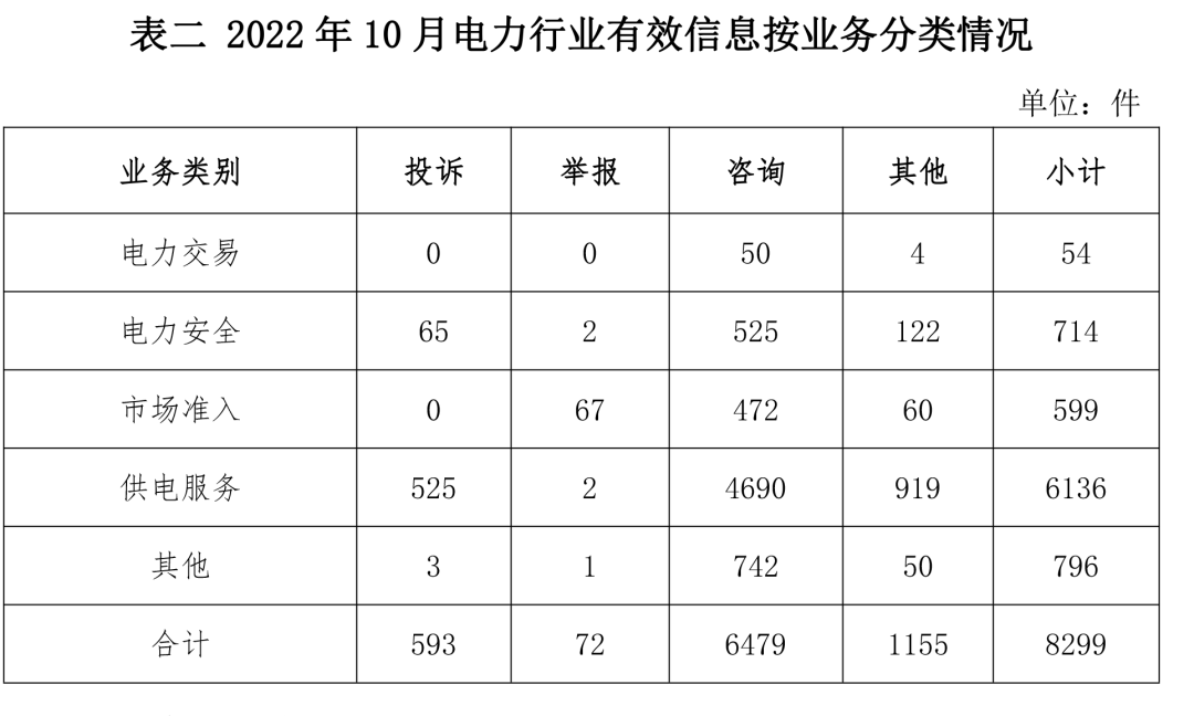 电力行业排在首位,有效信息数量为8299件,占全部有效信息的62.69%。群众关注的内容主要集中在供电服务、电力安全、市场准入等方面。(2022年10月电力行业有效信息按业务分类情况见表二)