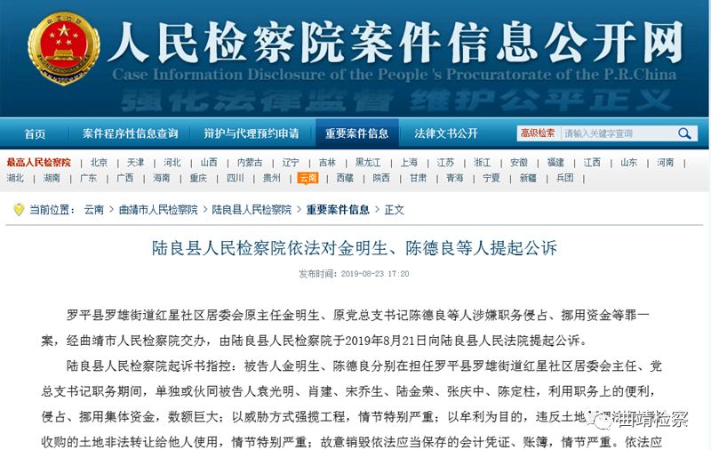 罗平县罗雄街道红星社区居委会原主任金明生、原党总支书记陈德良等人涉嫌职务侵占、挪用资金等罪一案,经曲靖市人民检察院交办,由陆良县人民检察院于2019年8月21日向陆良县人民法院提起公诉。