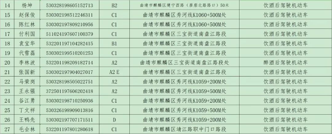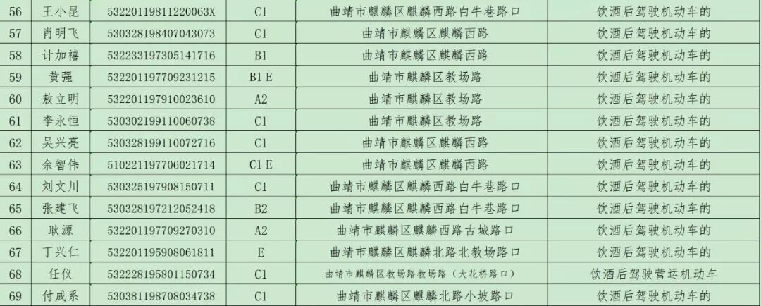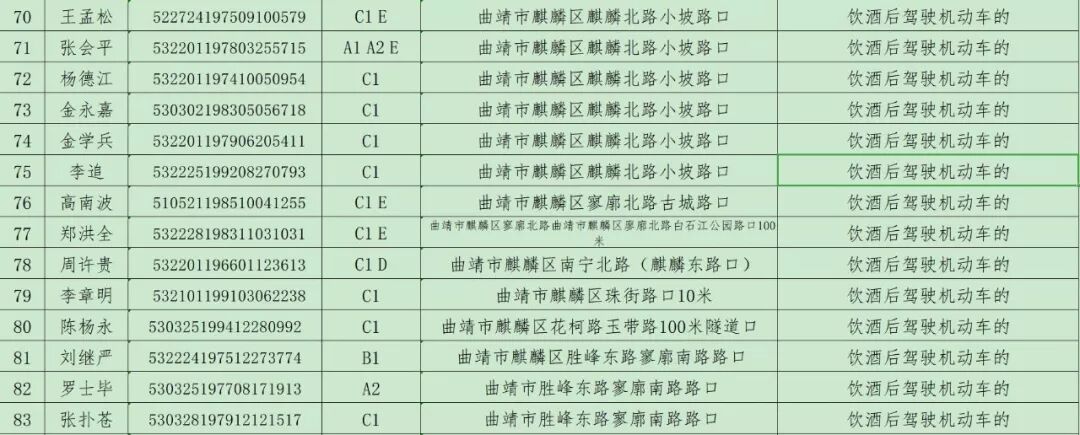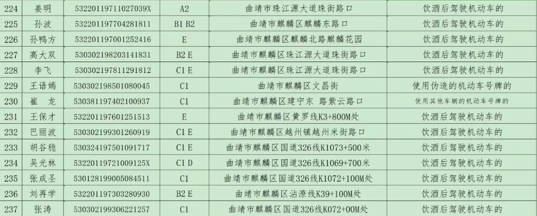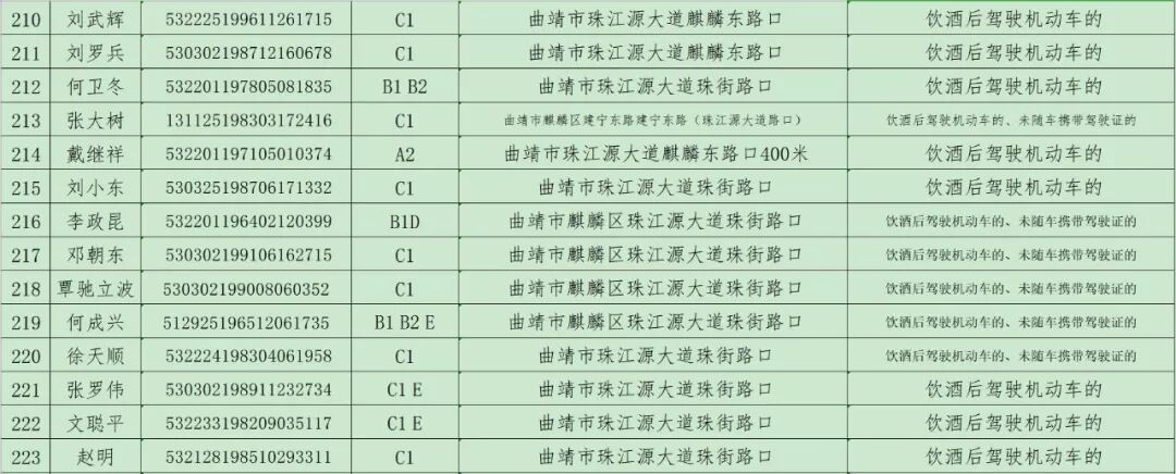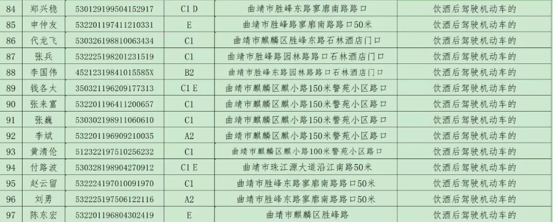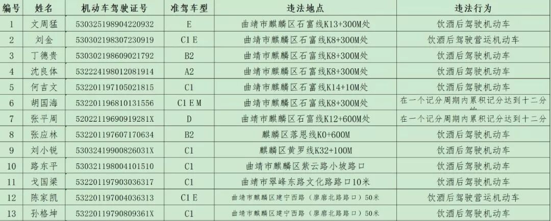 根据《中华人民共和国道路交通安全法》等相关法律法规规定,对以下因实施道路交通违法行为被依法扣留机动车驾驶证,且未在十五日内到曲靖市公安局麒麟分局交通警察大队接受处理的道路交通违法行为人,特此公告解除相关行政强制措施,并将根据《中华人民共和国道路交通安全法》第一百一十条第二款的规定拟给予吊销机动车驾驶证的处罚。请以下人员自公告之日起3个月内到曲靖市公安局麒麟分局交通警察大队接受调查处理,并可以对违法行为及事实提出陈述和申辩,可以行使要求听证的权利,逾期不来接受调查处理的视为放弃相关权利,依法作出吊销机动车驾驶证处罚。