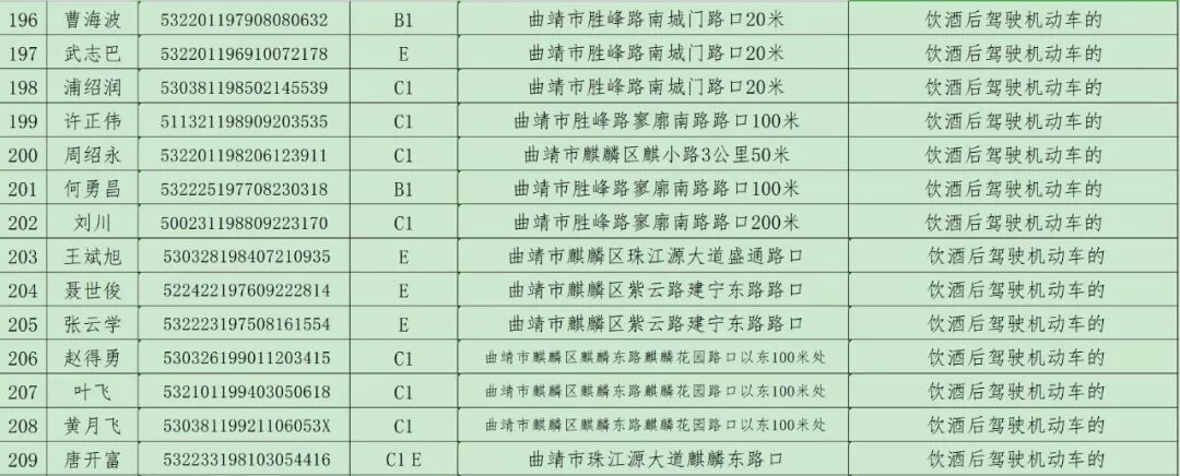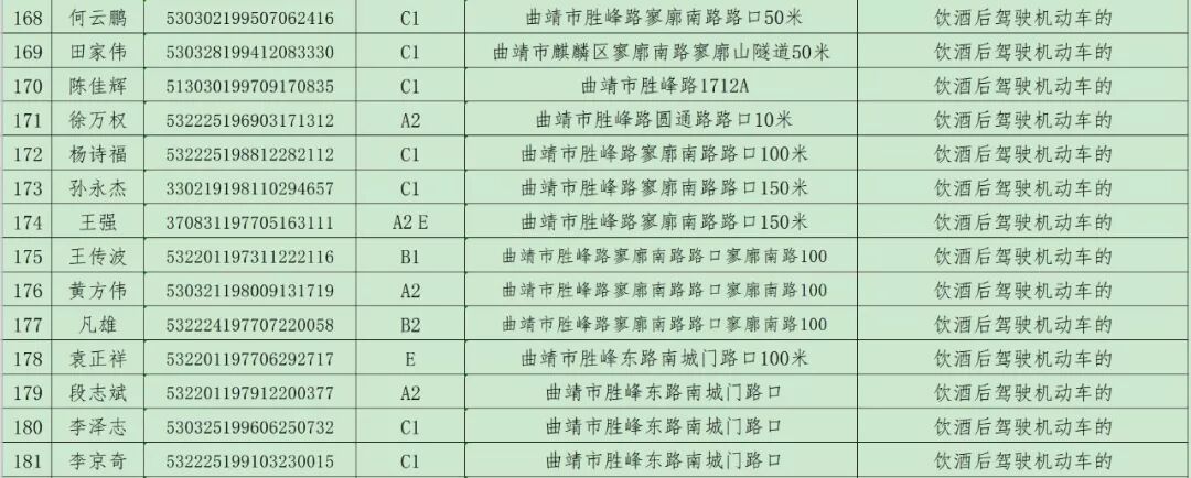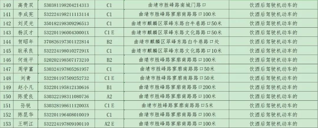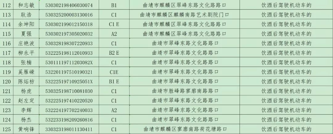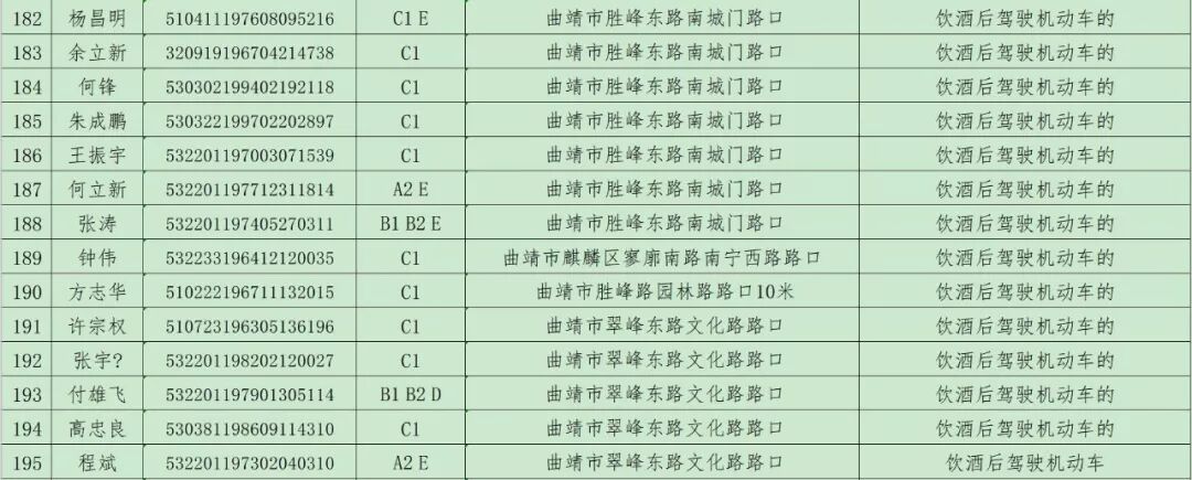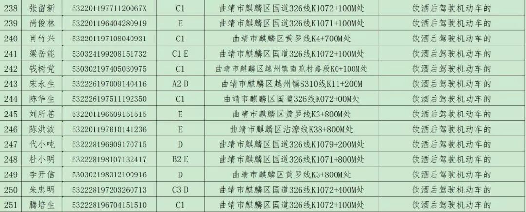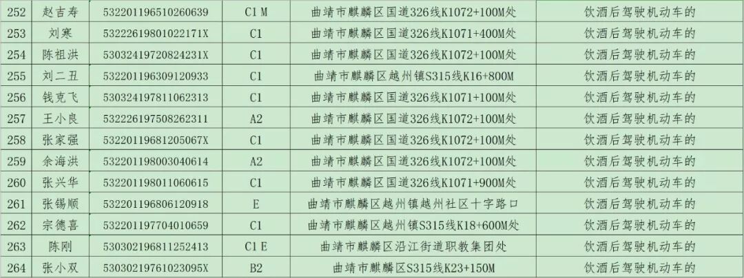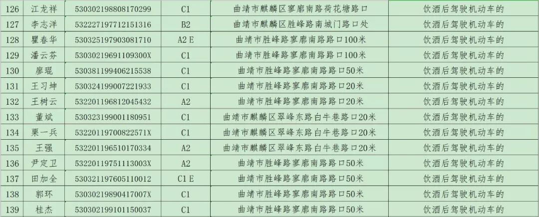 根据《中华人民共和国道路交通安全法》等相关法律法规规定,对以下因实施道路交通违法行为被依法扣留机动车驾驶证,且未在十五日内到曲靖市公安局麒麟分局交通警察大队接受处理的道路交通违法行为人,特此公告解除相关行政强制措施,并将根据《中华人民共和国道路交通安全法》第一百一十条第二款的规定拟给予吊销机动车驾驶证的处罚。请以下人员自公告之日起3个月内到曲靖市公安局麒麟分局交通警察大队接受调查处理,并可以对违法行为及事实提出陈述和申辩,可以行使要求听证的权利,逾期不来接受调查处理的视为放弃相关权利,依法作出吊销机动车驾驶证处罚。