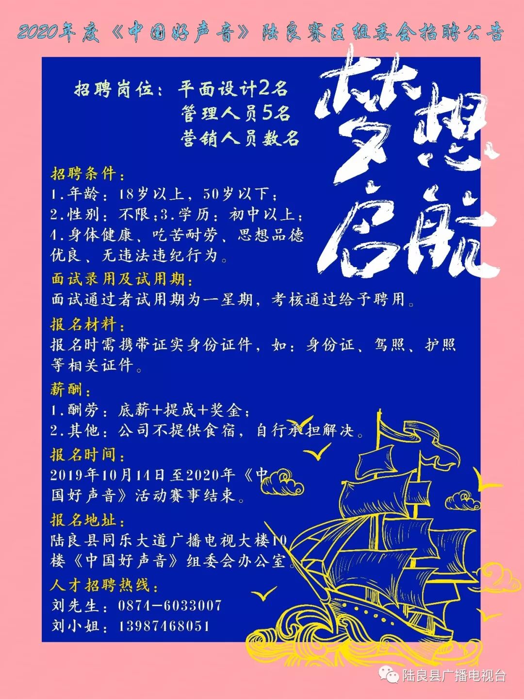 《中国好声音》是由浙江卫视推出的一档具有社会影响力,收视率极高的大型音乐励志节目。现由陆良融媒体中心、云南广电网络集团陆良支公司、万能哥广告公司联合承办的2020年度《中国好声音》陆良赛区商议决定面向社会公开招聘工作人员。