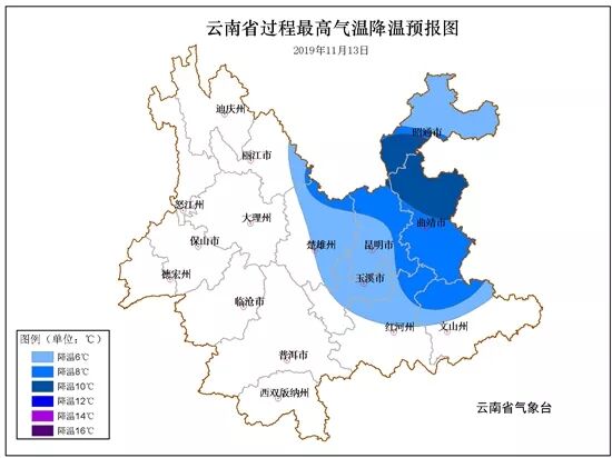 受冷空气影响,预计11月13日滇中及以东以南地区将出现明显降温降雨,最高气温将下降4-6℃,局地下降8-10℃;昭通、曲靖、文山、红河、玉溪、昆明、楚雄、丽江东部、普洱、西双版纳阴有小雨局部中雨。