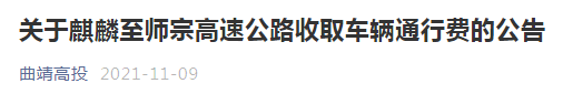 记者11月9日从曲靖高速公路投资有限公司官方微信公众号获悉,麒麟至师宗高速公路经交工验收合格,具备通车运营条件,将于11月15日8时起对过往车辆收取车辆通行费。