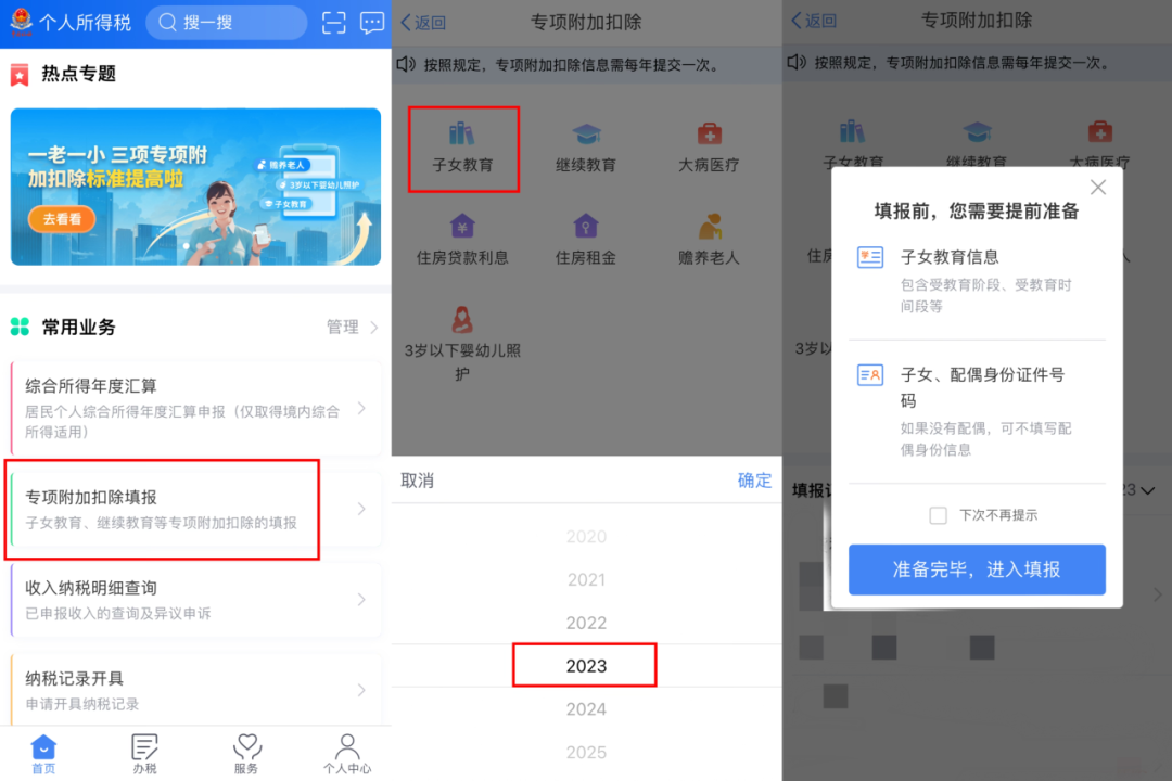 1.打开个人所得税APP—点击专项附加扣除填报—选择子女教育和2023年度—准备相关资料信息点击进入填报。