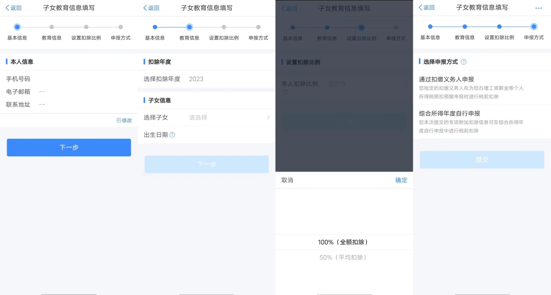 2.照步骤依次填写好“基本信息”、“教育信息”、“扣除比例”和“申报方式”后点击提交。