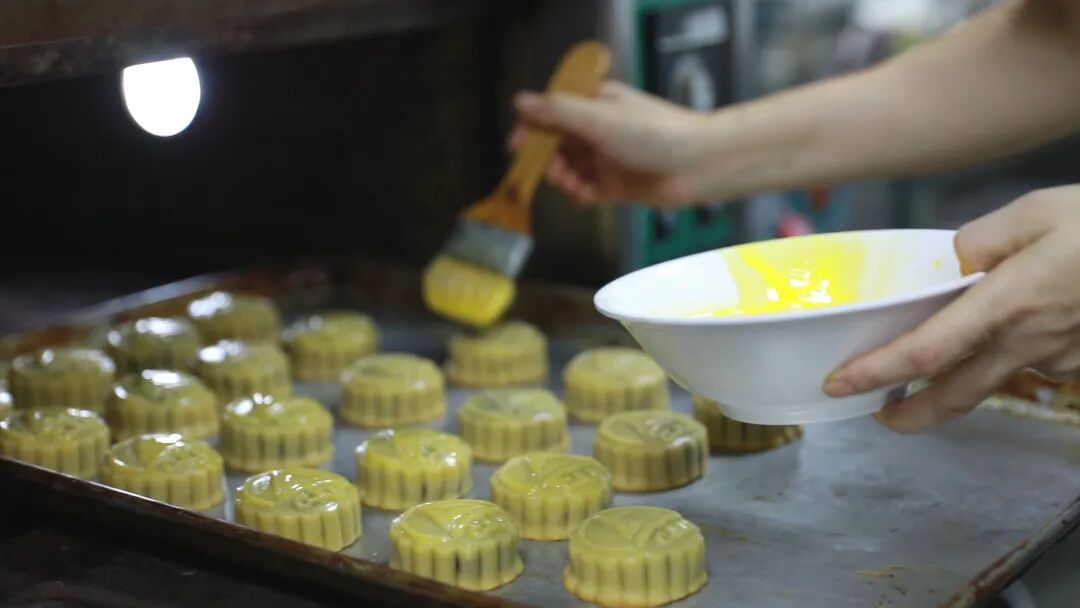 金黄的蛋液均匀地涂抹,将做好的月饼放入高温烤箱,静候热腾腾的月饼新鲜出炉。
