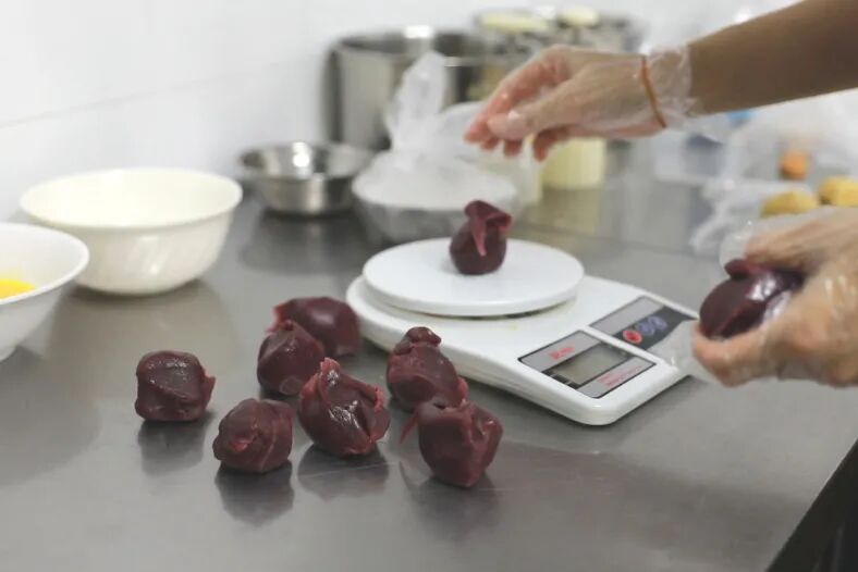 月饼馅和饼皮的制作精细讲究,精确称重。优质的食材与各样的配料混合在一起,汇聚出思念的香甜。