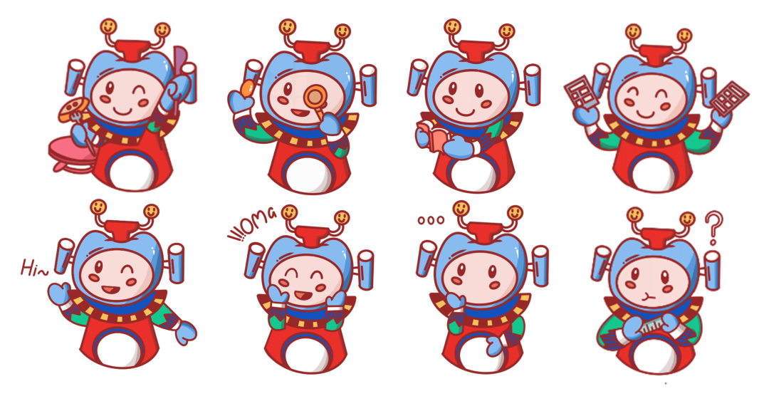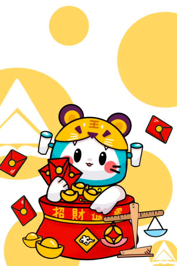 设计说明:结合财神、舞狮、丰收、灯笼等新年传统元素,色彩运用上选取喜庆和活泼的颜色,设计了5种带有美好寓意的量量形象,可用于红包、春联等新年物品上。在形象上相较于前期增加了“年年有余”的形象,为虎年新年祈福。
