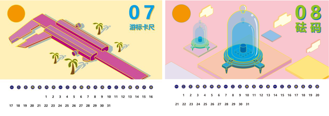 设计说明:从古代的日晷到现代的计量仪器,按照历史上的发展顺序对应到每一个月份中。同时,月历上不同的季节由不同的配色和主题来表现。