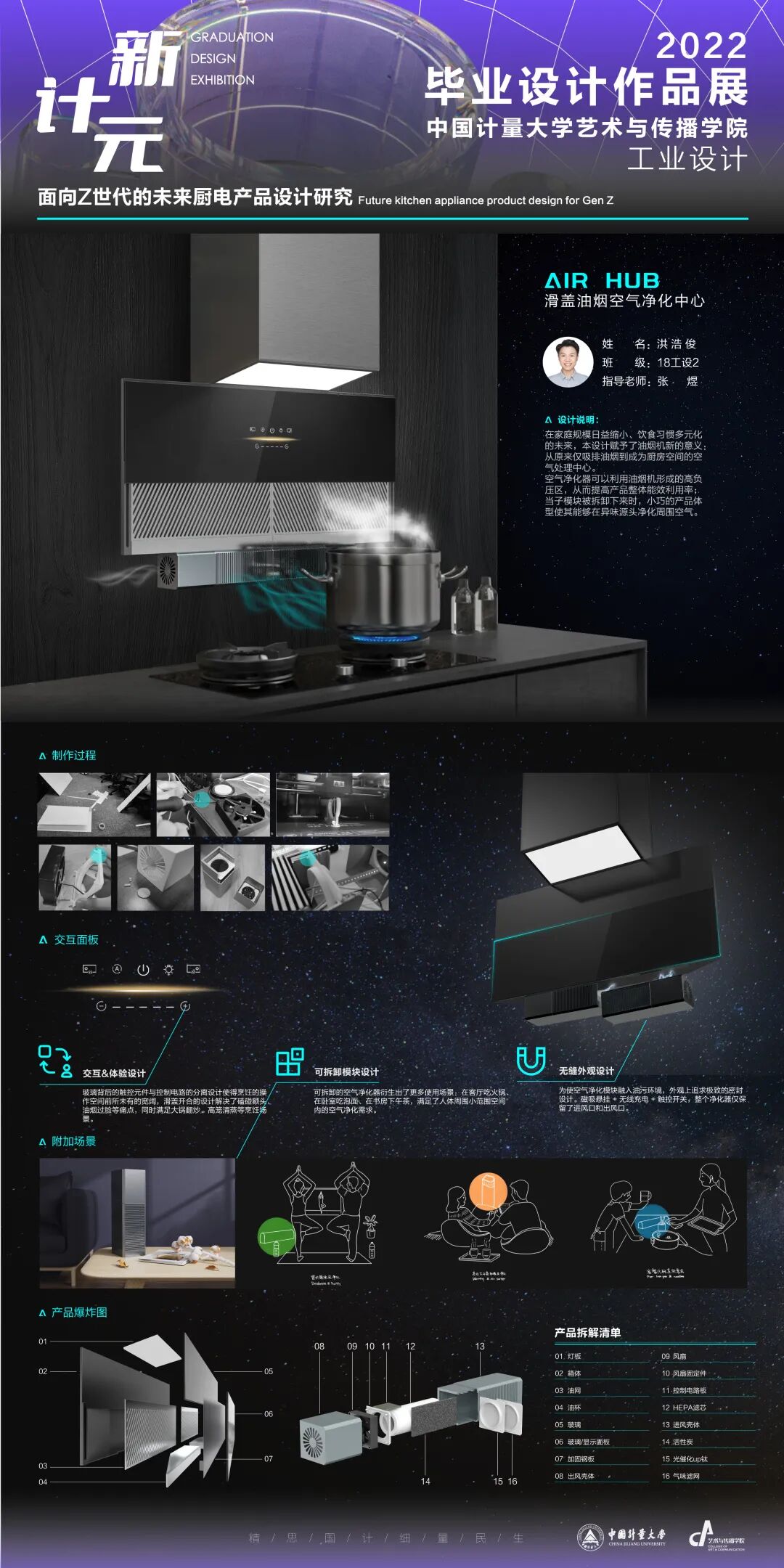“针对现有的油烟机对有害气体处理能力不足的问题,我的设计利用了油烟机的强吸力属性,将燃烧不充分产生的有害气体引入空气净化器净化。”洪浩俊介绍,“而可拆卸的空气净化器使用场景更加灵活,吃火锅、泡面时放在靠近锅的位置,可以有效地去除异味。”Z世代用户追求多元化的饮食生活,“健康烹饪,享受生活”也正是产品的意义所在。