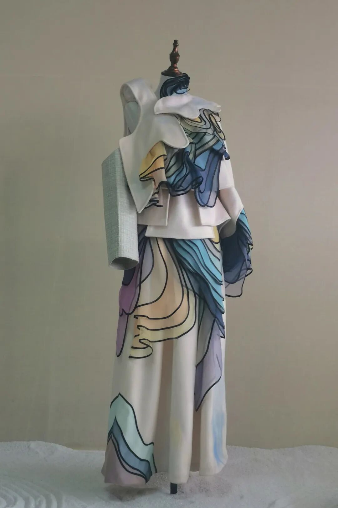 互联网普及千家万户之际,越来越多的快餐文化、碎片时间占据了我们的生活,让我们的艺术审美潜移默化地改变,传统工艺包含的内涵也越来越难以发展与推广。作品结合枯山水与传统服饰文化,从肌理、色彩、动感、展成四方面入手,制成两套枯山水样式成衣,并融入装置艺术、行为艺术完成最终的落地展成。