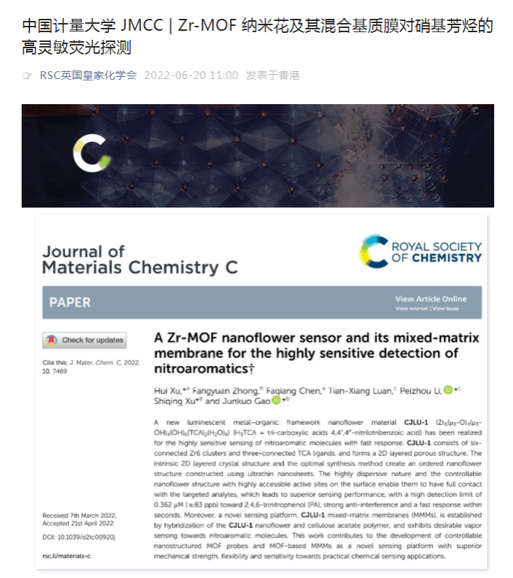 近日,我校光电学院徐时清团队在多孔MOFs材料混合基质膜做环境污染物硝基芳烃的高效荧光传感研究方面取得重要进展,相关成果以“A Zr-MOF nanoflower sensor and its mixed-matrix membrane for the highly sensitive detection of nitroaromatics ”为题发表在国际著名期刊J. Mater. Chem. C上(IF=7.393),并入选为期刊热点文章(HOT Papers)。光电学院青年教师徐绘为文章的第一作者,中国计量大学为第一通讯单位。同时,该工作被RSC 英国皇家化学会官方公众号以《中国计量大学 JMCC | Zr-MOF 纳米花及其混合基质膜对硝基芳烃的高灵敏荧光探测》为题进行报道(https://mp.weixin.qq.com/s/rqUERiHvd2WPJBKvuaIzyg)。