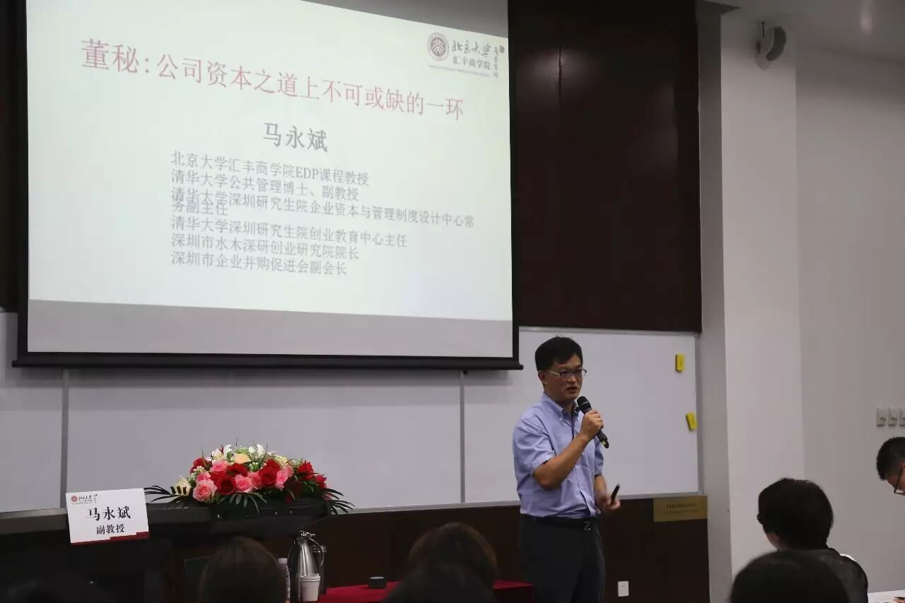 2017年8月7日下午,第三期北大汇丰EDP企业家沙龙——“董秘—公司资本之道上不可或缺的一环”在521教室隆重举行。此次活动邀请到北京大学汇丰商学院EDP课程教授、清华大学公共管理博士、副教授、清华大学深圳研究生院企业资本与管理制度设计中心常务副主任马永斌副教授为同学们解读上市公司创始人在资本之道上最重要的岗位之一——董秘的重要性。
