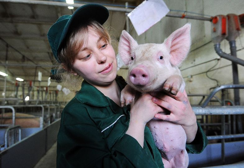 ▲俄罗斯一家养猪场的工人与小猪仔(俄新社)
