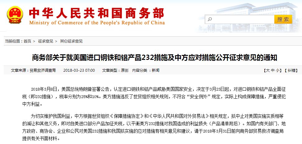 ▲3月23日,商务部发布了针对美国进口钢铁和铝产品232措施的中止减让产品清单并征求公众意见。(商务部网站)