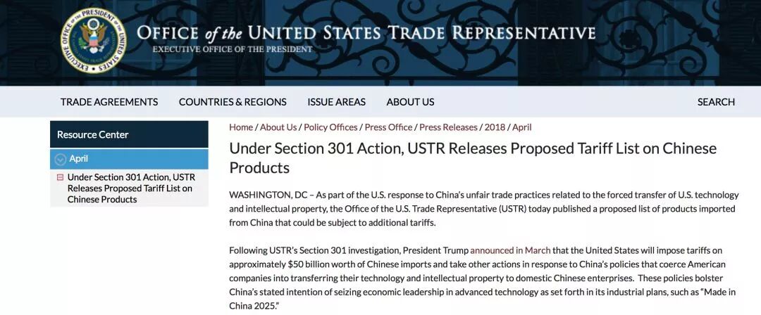 ▲美国贸易代表办公室网站截图