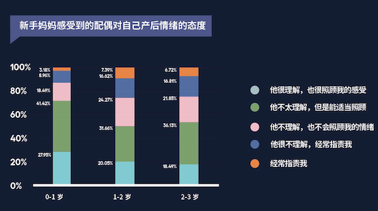 综合来看,1-2岁孩子的新手妈妈处于过渡期,面临着较大的情绪压力,主要压力来自对孩子健康及生长发育的焦虑和担心。配偶对新手妈妈产后情绪的理解及照顾尤为重要,从配偶处获得社会支持,对夫妻满意度有积极影响。