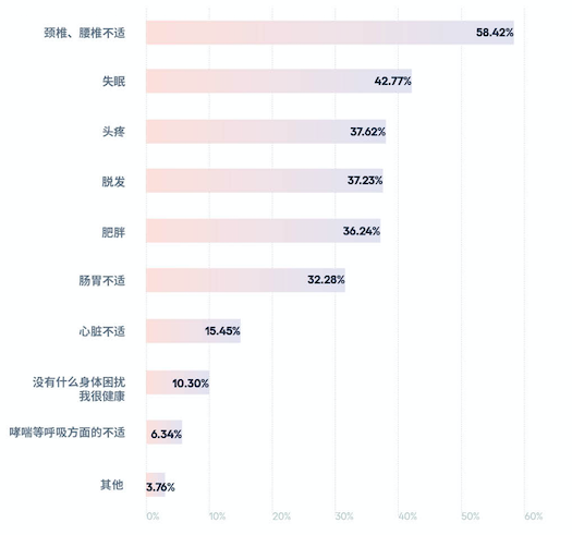 。此外,职场人失眠、脱发、肠胃不适等身体症状,也有可能和心理健康有关,职场人需要更多地关照内心,通过自我调节缓解心理压力。