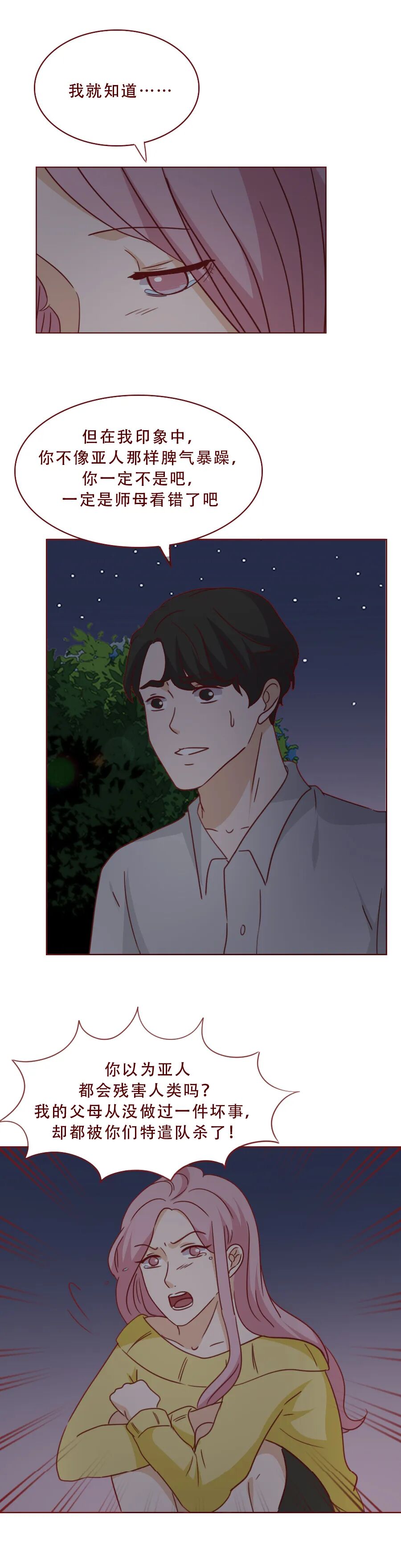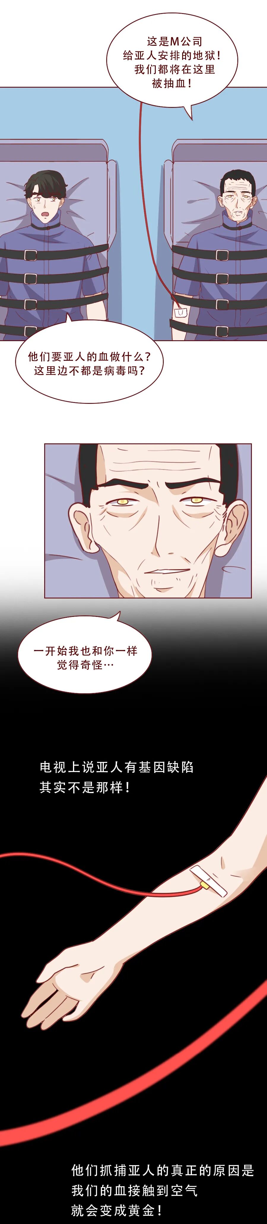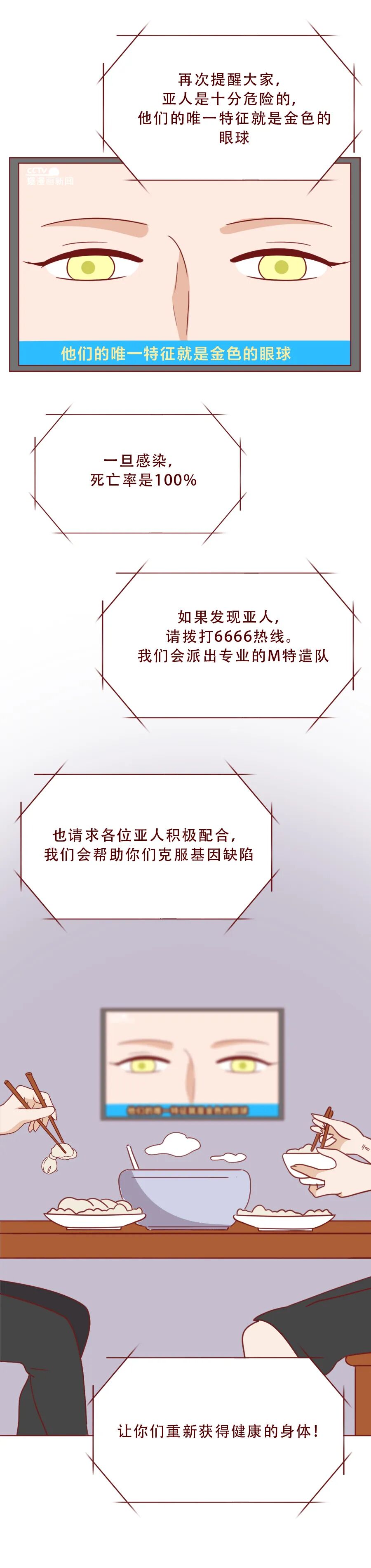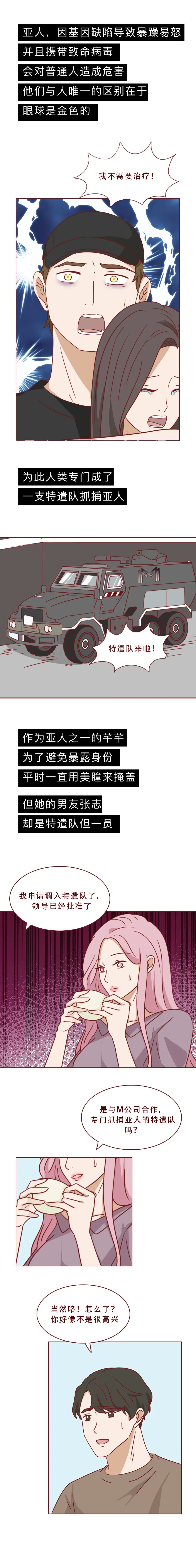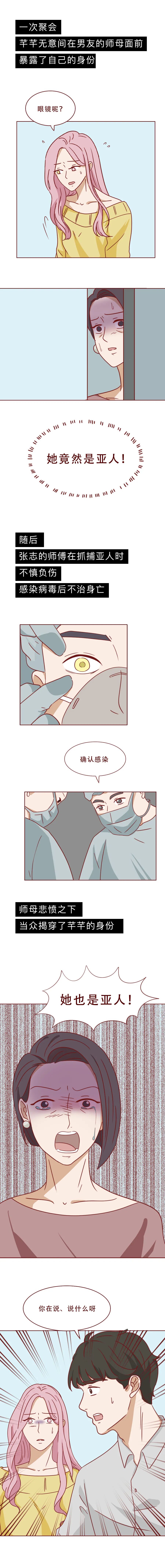 亚人,天生暴躁易怒并且携带致命病毒。如果被传染,那么致死率达到100%。因此一直受到M公司成立的特遣队伍追捕。亚人和人类唯一的区别就是,眼球是金色的,因为种性劣等,被称之为亚人。漫画中的女主芊芊,也是亚人。平时靠戴美瞳来掩盖自己的身份。但她的男友张志却是特遣队的一员。聚会中,女主不小心暴露了自己的身份,并在接下来的意外中被当众揭露了自己隐藏的秘密。女主能否逃出生天,和张志又会有怎样的结局?一起来看今天的漫画吧!