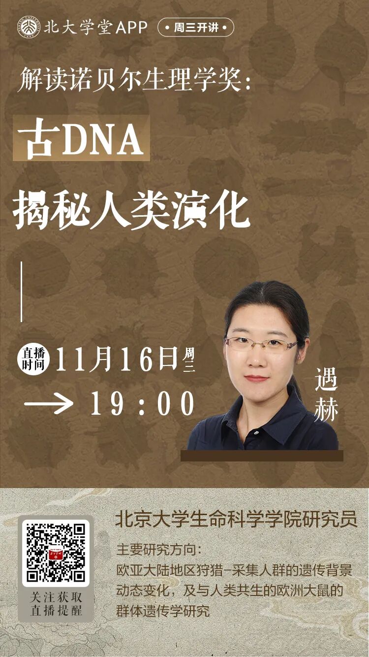 11月16日(周三)晚19:00,北京大学生命科学学院研究员遇赫老师做客北大学堂“周三开讲”栏目,讲授《解读诺贝尔生理学奖:古DNA揭秘人类演化》主题直播课程。讲述人类演化的基本概念,分析从达尔文时代到基因组时代,理论和技术的发展对人类演化的启示。从Svante Pääbo出发介绍古代DNA研究领域的发展,从古DNA研究解读人类的演化历史,从不同方面介绍古代DNA技术如何推动对人类演化的探索。