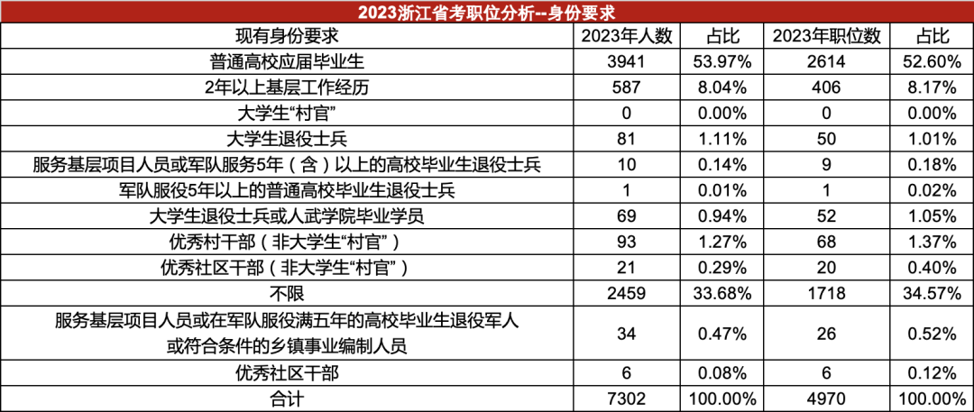 2023浙江省考的“主力军”依然是普通高校应届毕业生,计划招录人数为3941人,占总人数的53.97%;职位数为2614个,占总职位数的52.60%。