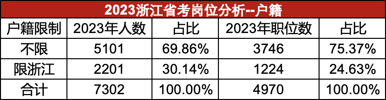2023浙江省考计划招录7351人(含残疾人岗位人数),4970个职位(不含残疾人岗、优秀辅警岗)。其中3746个职位不限户籍,占比75.37%,外省户籍考生可放心报考。