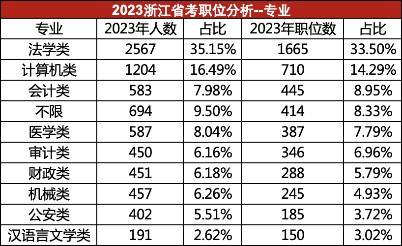 相较于2022年省考来说,法学类招录人数增加1032人,职位数增加550个。浙江省考具体岗位对专业的限制和要求,体现了人岗匹配原则。