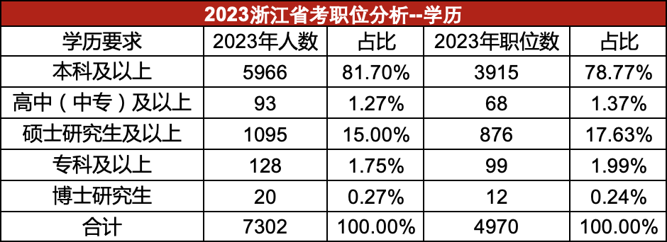 和刚结束报名的国考不同,2023浙江省考职位,关于学历要求里仅有“本科及以上”“博士研究生”“高中(中专)及以上”“硕士研究生及以上”“专科及以上”,无“仅限本科”的要求。
