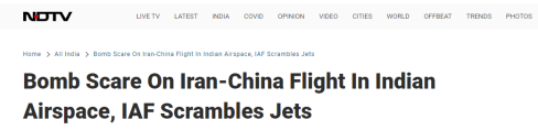 据环球网援引外媒3日报道,一架从德黑兰飞往广州的伊朗马汉航空航班在飞行途中遭遇了“虚假的炸弹警报”惊魂。3日下午,新德里电视台(NDTV)、《印度时报》等多家印度媒体发布消息称,当日早些时候从伊朗德黑兰飞往中国广州的一架航班在飞入印度空域后收到炸弹威胁。伊朗马汉航空官方推特账户随后发表声明,证实该航班一度收到“炸弹威胁”,但随后发现是假消息,飞机是安全的。马汉航空同时表示,该航班已安全降落。新德里电视台(NDTV)报道截图。航班信息APP飞常准的数据显示,该航班为一架空客A340客机,于当地时间3日4时17分从德黑兰出发,已于北京时间3日17时02分抵达广州。飞常准提供的航班飞行轨迹图显示,该航班曾在新德里上空盘旋数圈。根据航班信息平台FlightRadar24显示信息,飞机曾在新德里上空盘旋数圈。