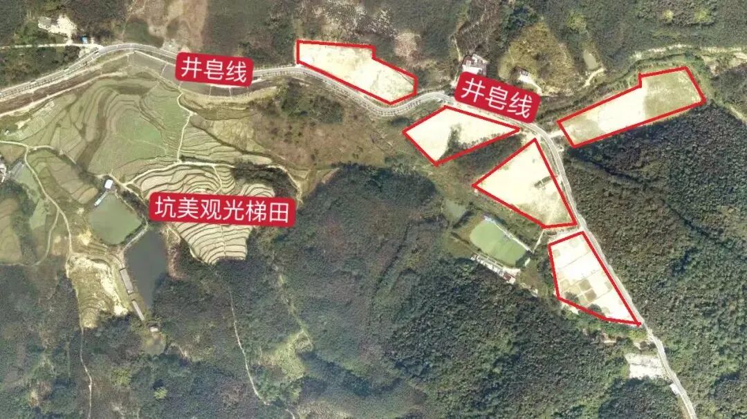 坑美观光梯田:在坑美观光梯田游玩时,请将车辆规范停放至临时停放点内(下图红框区域),具体位置如下: