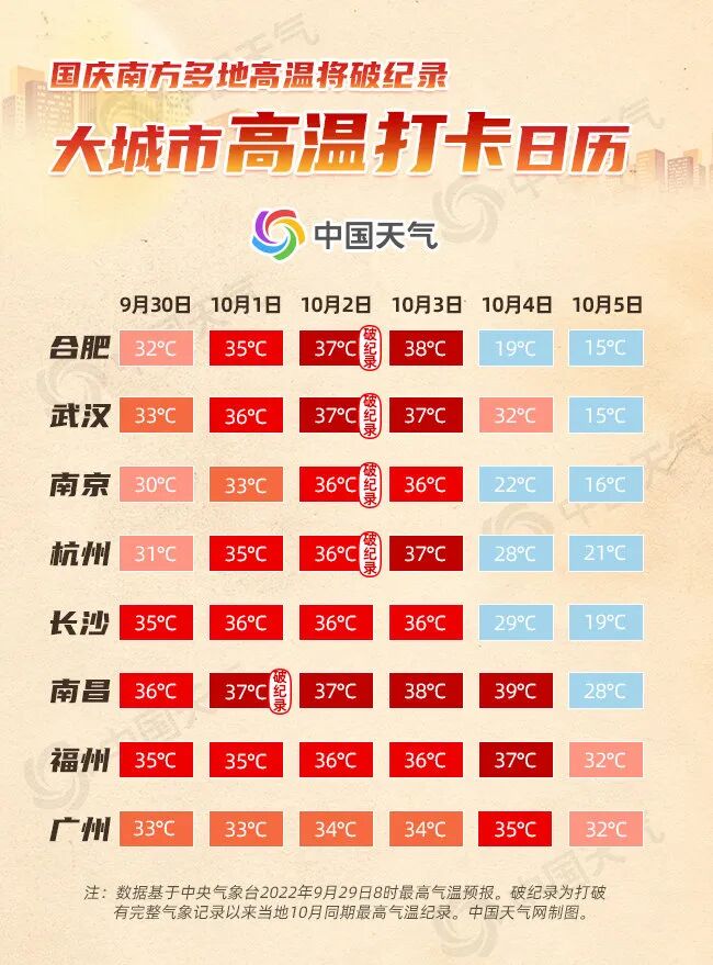 今年国庆假期前期(10月1日至4日),我国南方将出现同期罕见的大范围高温天气!武汉、合肥、杭州、南昌、南京等多地将打破10月最高气温纪录,热如盛夏。