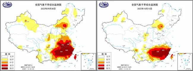 那么,长江流域的旱情是否已经发生了转变呢?中国天气网对比9月30日与10月13日的气象干旱综合监测图发现,气象干旱区域确实有所缩减,湖北中北部、安徽中北部等地退出气象干旱区;湖北南部、安徽南部等地的干旱等级有所降低。