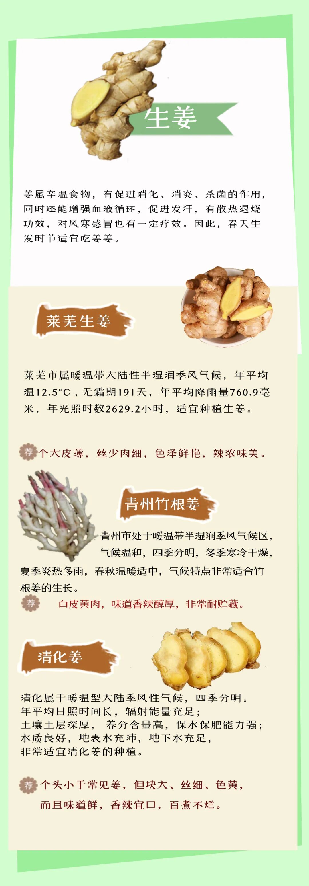 中医认为,春季保健,应该要特别注意肝脏保养,因为春季有阳气开始升发的特点,所以应多吃一些辛甘发散性质的食物,生姜便是其中一种。生姜属辛温食物,有促进消化、消炎、杀菌的作用,同时还能增强血液循环,促进发汗,有散热退烧功效,对风寒感冒也有一定疗效。因此,立春时节适宜吃姜。