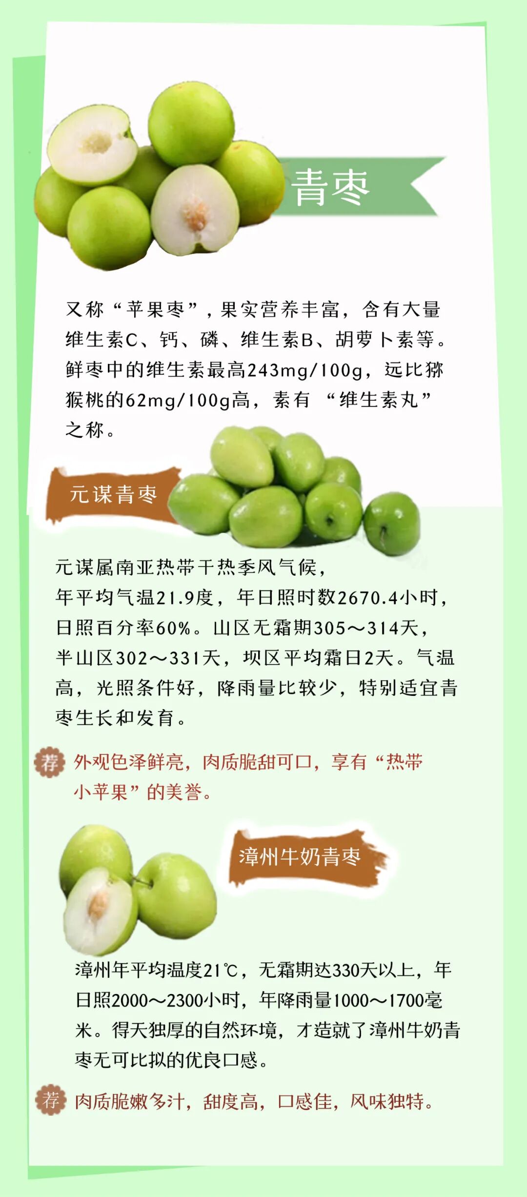 青枣又称“苹果枣”,果实营养丰富,含有大量维生素C、钙、磷、维生素B、胡萝卜素等。鲜青枣中的维生素最高243mg/100g,远比猕猴桃的62mg/100g要高,素有”维生素丸”之称。