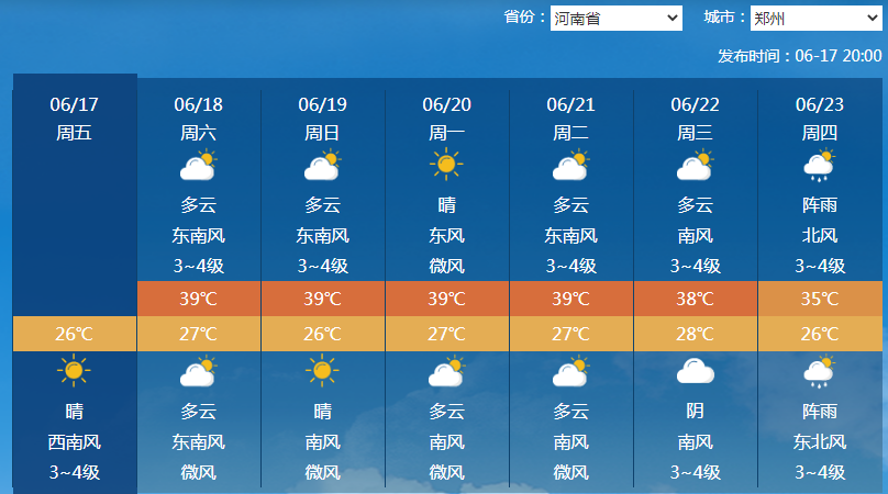 中央气象台预计,一直到21日,河南、河北西部和中南部、北京南部、山西大部、山东、安徽北部、江苏、湖北北部以及内蒙古中西部、陕西大部、甘肃西部、宁夏西部、新疆东疆和南疆盆地等地将出现持续高温天气,日最高气温35~38℃。